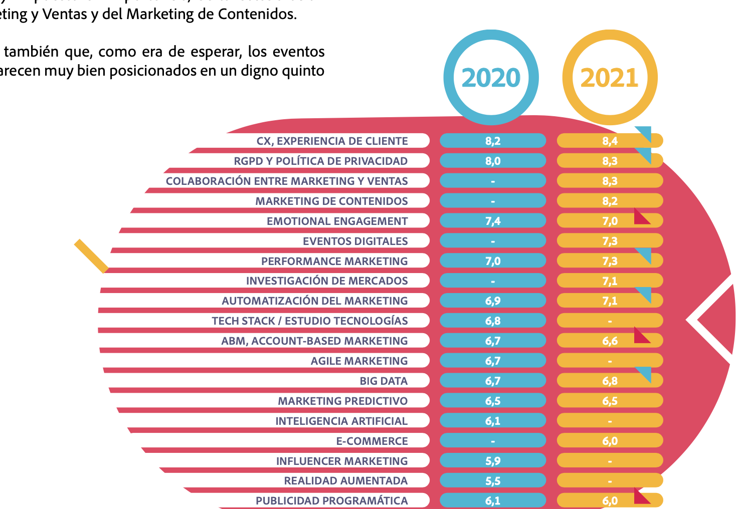 Las principales diferencias con el mismo estudio en 2021 son la aparición en la 3 y 4 posición la Alineación de Marketing y Ventas y la Estrategia de Contenidos. Los Eventos digitales se convierten igualmente en una tendencia al alza.