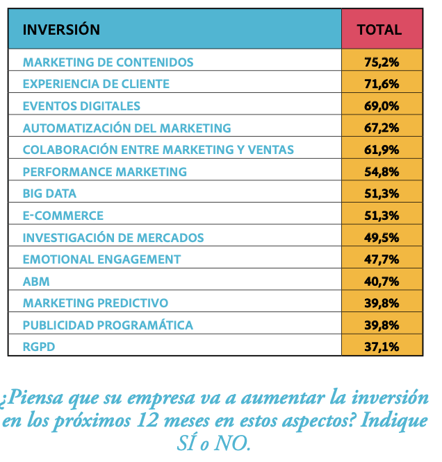 No hay duda; Estrategia de Contenidos y Experiencia de Cliente y muy de cerca la automatización de Marketing y los eventos digitales coparán la inversión en los próximos meses confirmando las Tendencias en Marketing B2B