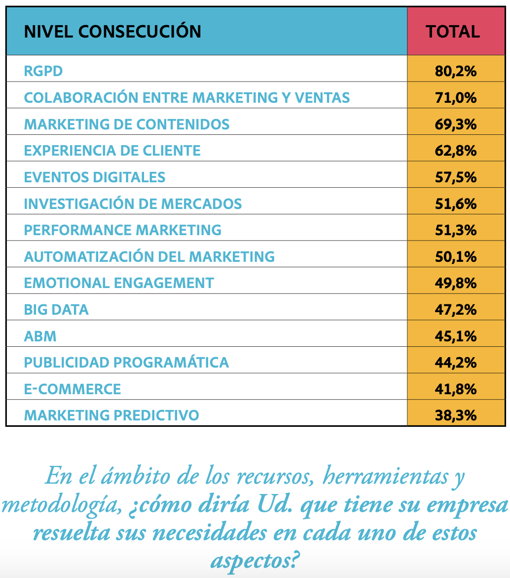 A la hora de manifestar aquellas disciplinas donde se consideran razonablemente superadas las expectativas de implantación en ABM y Estrategia de Contenidos para B2B. En B2C performance y programática.