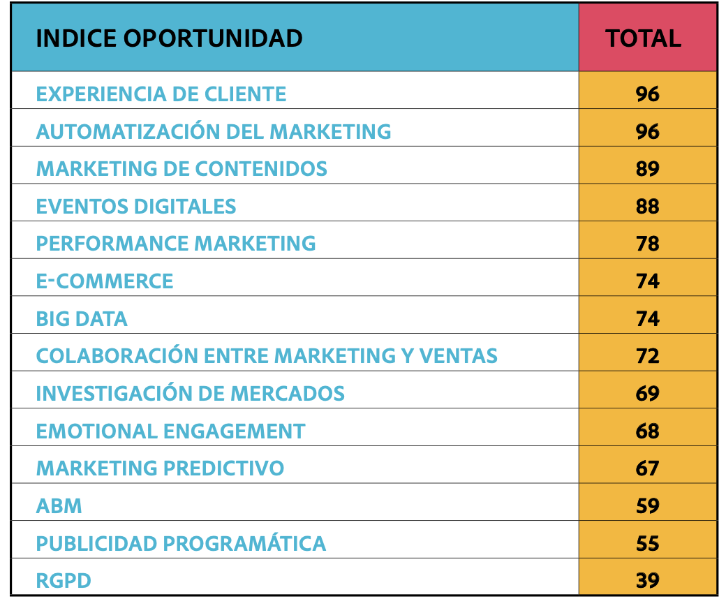 En B2C llama la atención el Big Data, en segundo lugar, y el Marketing Predictivo, que va a continuación. También el E-Commerce mejora con mucho su situación con respecto a la tabla del B2B.